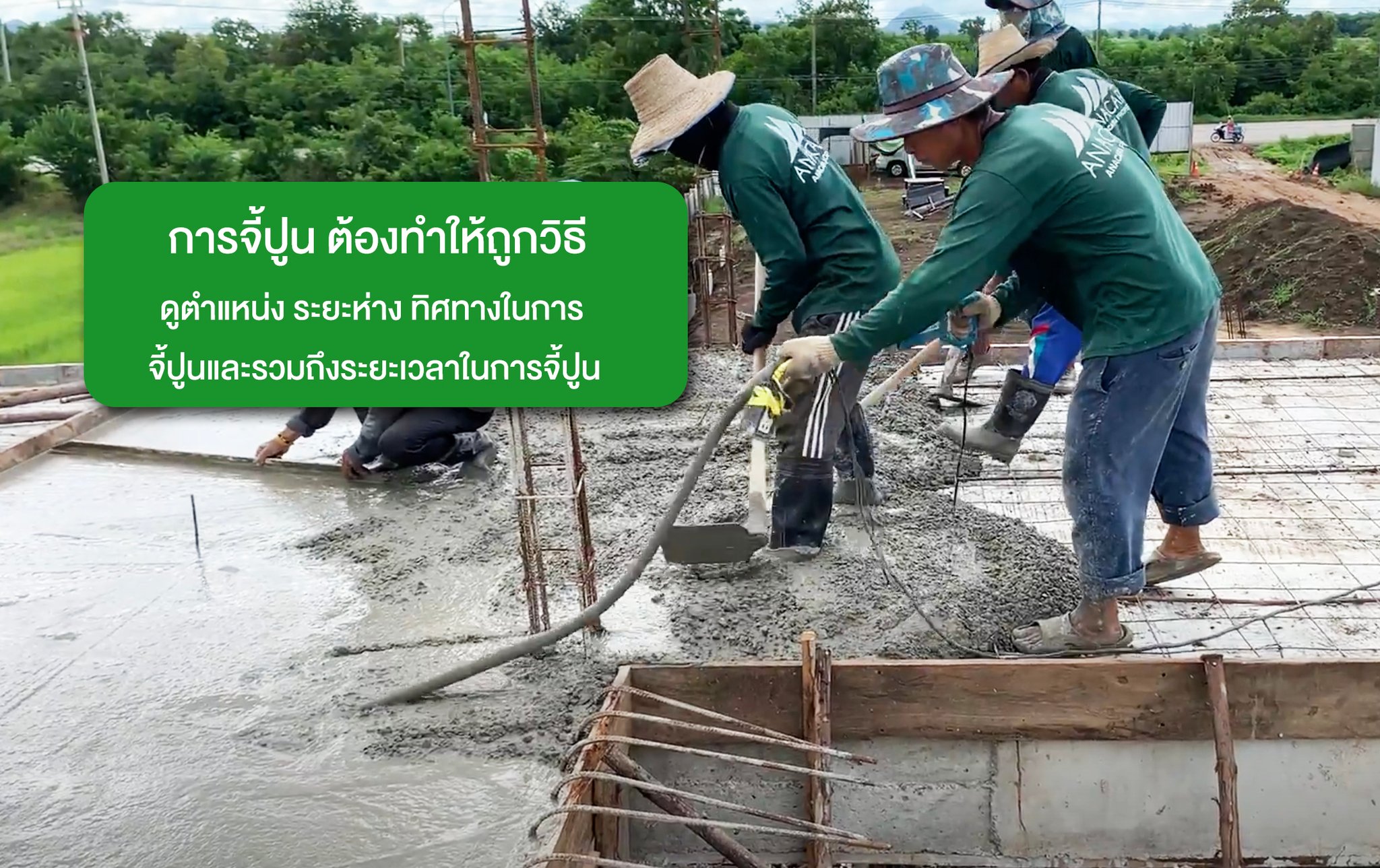 จี้เขย่าให้ทั่วทั้งบริเวณด้วยระยะจี้ที่เหมาะสมถ้าจี้นานเกินไปคอนกรีตจะเกิดการแยกตัว